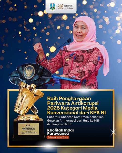 Pemprov Jatim meraih Penghargaan Pariwara Anti Korupsi 2025 untuk Kategori Media Konvensional dari Komisi Pemberantasan Korupsi (KPK) RI. Penghargaan diberikan langsung oleh Pimpinan KPK RI, Ibnu Basuki Widodo kepada Gubernur Jatim Khofifah Indar Parawansa.