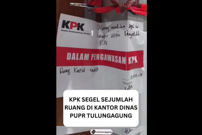 Video berdurasi 37 detik yang merekam suasana ruangan-ruangan dinas PUPR yang digembok dan dipasang segel warna merah bertuliskan “dalam pengawasan KPK” beredar melalui unggahan @Tulungagung Eksis, terpantau di media sosial Instagram, Sabtu.