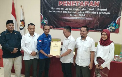 KPU Kabupaten Situbondo secara resmi menetapkan dua pasangan calon bupati dan wakil Bupati Situbondo periode tahun 2024-2029, di Hotel Rosali Minggu (22/9). Kedua pasangan calon bupati dan wakil Bupati tersebut yakni Karna Suswandi-nyai Khoirani dan Yusuf Rio Wahyu Prayogo-Ulfiyah.