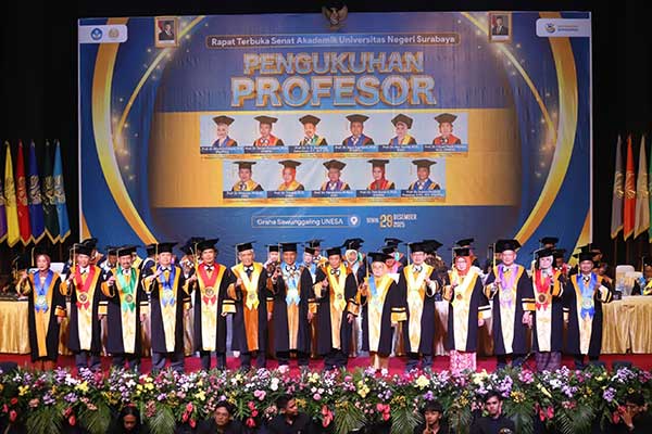 Universitas Negeri Surabaya (Unesa) mengukuhkan 11 Profesor baru di Graha Sawunggaling Unesa Surabaya. Pengukuhan sebagai energi strategis untuk memperkuat kiprah Unesa menyongsong tahun 2026 dan visi Indonesia Emas 2045, Senin (29/12).