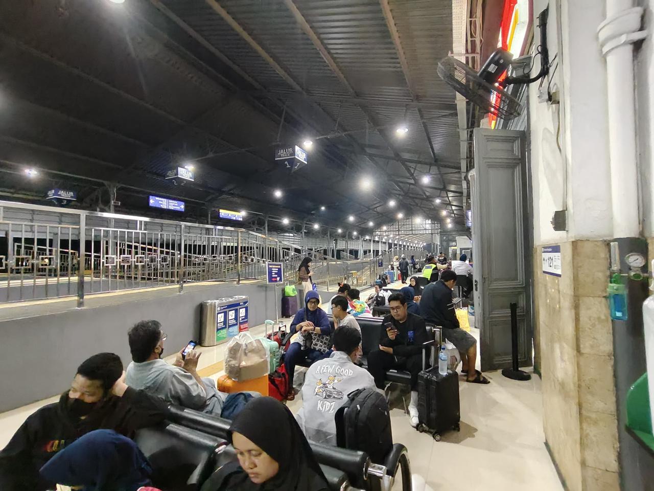 Sejumlah penumpang KA Blambangan Ekspres memadati stasiun Gubeng Surabaya.