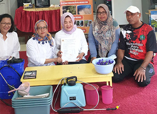 “Sehingga diberikan pelatihan membuat probiotik dan pupuk cair probiotik. Probiotik merupakan bahan (pangan, pupuk, pestisida) yang mengandung mikroorganisme hidup yang secara aktif meningkatkan kesehatan (usus, tanaman, ternak) dengan cara memperbaiki keseimbangan flora (usus, tanah) jika diberikan dalam keadaan hidup. Probiotik dibuat dari bahan-bahan yang mudah diperoleh masyarakat dan mudah dibuat. Bahan yang digunakan diantaranya daun lamtoro, daun ketepeng, bonggol pisang, ikan setengah busuk dan starter atau biang,” papar Tiurma .