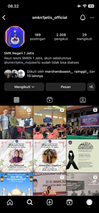 Setelah dilakukan perubahan, akun Instagram SMKN 1 Jetis Mojokerto mencatat peningkatan jumlah pengikut dari 2. 308 menjadi 2. 657. Selain itu, jumlah penonton reels dan interaksi pada setiap unggahan juga mengalami peningkatan yang signifikan. Akun menjadi lebih gampang ditemukan dan dipercaya oleh publik berkat informasi yang jelas dan menyeluruh.