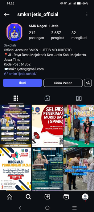 - Mengatur Bio Instagram: Saat ini, bio Instagram SMKN 1 Jetis Mojokerto telah lebih terampil dengan menyertakan alamat lengkap sekolah, email resmi, dan link situs web sekolah.