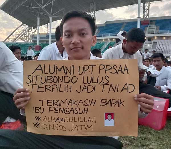 Mantan penerima manfaat (PM) Unit Pelaksana Teknis Perlindungan dan Pelayanan Sosial Asuhan Anak (UPT PPSAA) Situbondo Dinas Sosial (Dinsos) Jatim, Ansori berhasil lolos seleksi penerimaan prajurit Tamtama Tentara Nasional Indonesia Angkatan Darat (TNI AD) Tahun 2025.