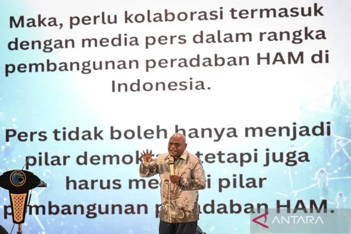 Menteri Hak Asasi Manusia Natalius Pigai mendorong pers tidak hanya berperan sebagai pilar demokrasi, tetapi juga menjadi pilar penting dalam pembangunan peradaban hak asasi manusia (HAM) di Indonesia.