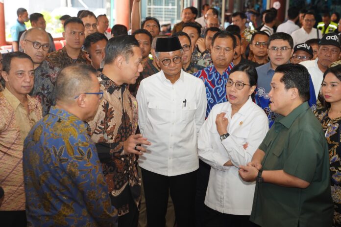 Menteri PU Dody Hanggodo bersama Sekretaris Kabinet Teddy Indra Wijaya, Menteri Keuangan Sri Mulyani, Menteri BUMN Erick Thohir, serta Wakil Menteri Pariwisata Ni Luh Puspa saat meninjau Terminal 2 Bandara Soekarno-Hatta, Tangerang, Banten, Sabtu (1/3/2025).