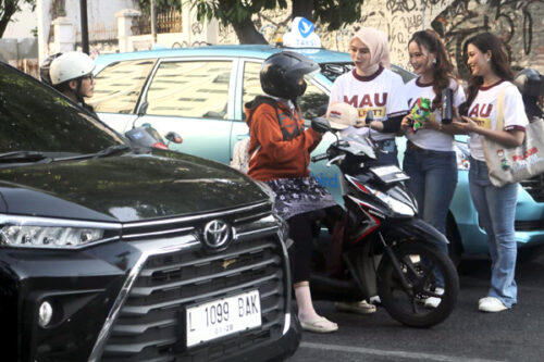 Para model melakukan sosialisasi dan membagikan souvenir kepada pengendara motor saat sosialisasi Pemilihan Gubernur Jawa Timur 2024 di Surabaya. [Rendy Agung Prakoso]