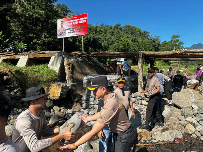 Kegiatan gotong royong yang mengusung semangat Polri peduli ini diselenggarakan secara khusus dalam rangka menyambut peringatan Hari Bhayangkara ke-80 tahun 2026. Aksi sosial kemanusiaan ini dipimpin langsung oleh Kapolres Situbondo AKBP Bayu Anuwar Sidiqie. Tanpa ragu, pucuk pimpinan Polres tersebut membaur bersama warga dan puluhan personel kepolisian untuk bahu-membahu mengerjakan material jembatan.