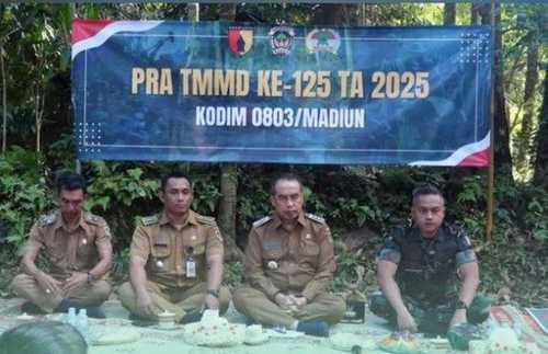 Bupati Madiun, H. Hari Wuryanto bersama Dandim 0803/Madiun Letkol Kav. Widhi Bayu Sudibyo menghadiri Pra TNI Manunggal Membangun Desa (TMMD) ke-125 di Desa Ngranget, Kec. Dagangan Kabupaten Madiun, Selasa (8/7/2025).sudarno/bhirawa