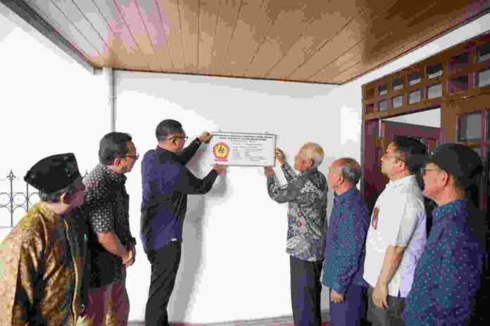 Direktur Manajemen Human Capital dan Administrasi PLN NP, TB Ari Wibawa Mukti (ketiga dari kiri) bersama Sutarno (keempat dari kiri) bersama memasang plakat pada dinding depan rumah Sutarno yang telah direnovasi sehingga menjadi hunian yang sehat.