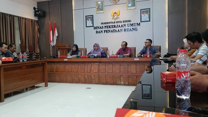 Konferensi pers langkah-langkah Pemkot Kediri dalam penyelesaian proyek pengembangan RTH Alun-alun Kota Kediri di Kantor Dinas PUPR Kota Kediri, Kamis (5/2).