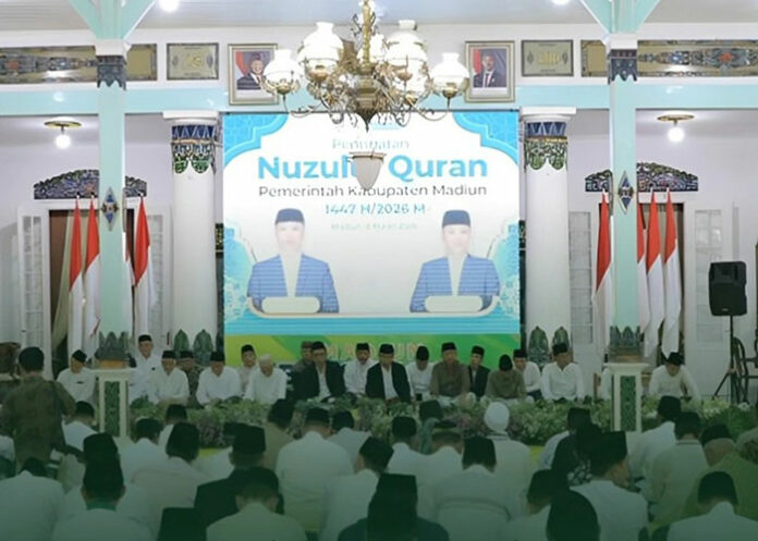 Pemerintah Kabupaten Madiun memperingati Nuzulul Qur’an 1447 H. Jumat (6/3) di Pendopo Muda Graha Madiun. Kegiatan di awali dengan simaan Al Quran oleh para Khafid Kab Madiun, mulai ba’da subuh sampai asar, di lanjutkan siraman rohani oleh KH, Ahmad Mizan Basyari, Pengasuh Pondok Pesantren Subbulul Huda Kembang Sawit Madiun.