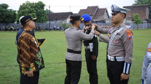 Kapolres Madiun AKBP Kemas Indra Natanegara, SH SIK MSi disaksikan Wakil Bupati Madiun dan Ketua DPRD Kab. Madiun menyematkan tanda petugas Pasukan Operasi Kepolisian Terpusat ‘Lilin Semeru 2025’ di Lapangan Tribrata, Polres Madiun, Jumat (19/12). foto: sudarno/bhirawa