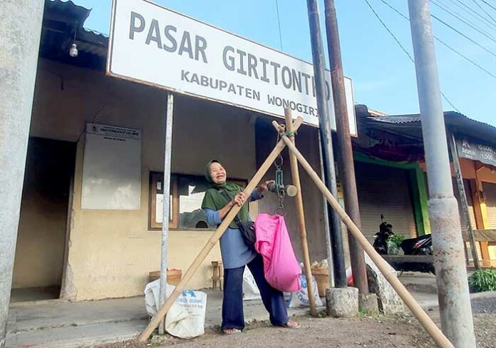 Ia sudah berjualan di pasar ini sejak tahun 1978, menjajakan beras dan kerupuk buatannya. “Kalau buka tiap hari, rasanya bukan Giritontro namanya,” tambahnya sambil tertawa kecil.