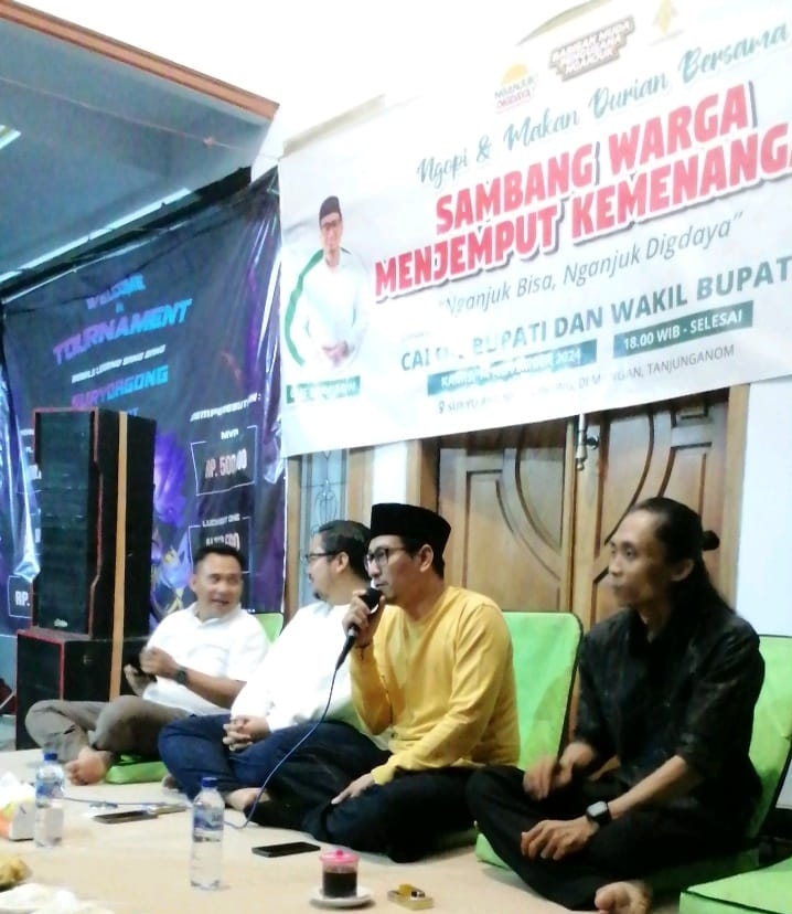 Sebagai pendatang baru di dunia politik dan tata pemerintahan daerah, langkah yang di lakukan pasangan calon (paslon) no urut 01 ini dengan belanja masalah sebagai upaya kampanye sekaligus untuK menyapa warga desa Demangan Kecamatan Tanjung Anom, Nganjuk. Dengan tajuk ngopi dan makan buah durian bareng Gus Ibin dan Aushaf di hadiri ratusan warga tidak hanya dari Desa Demangan, desa desa sekitar seperti Nglinggo, Mojoseto dan Karangsemi juga turut hadir.
