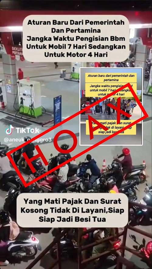 Pembatasan pengisian BBM hingga 7 hari untuk mobil dan 4 hari untuk motor, serta larangan bagi penunggak pajak kendaraan adalah Tidak benar. Penyaluran BBM, khususnya BBM Subsidi, tetap berjalan sesuai ketentuan pemerintah melalui mekanisme yang berlaku agar lebih tepat sasaran dan transparan. Hal ini juga sudah disampaikan oleh kementerian ESDM melalui juru bicara KESDM.