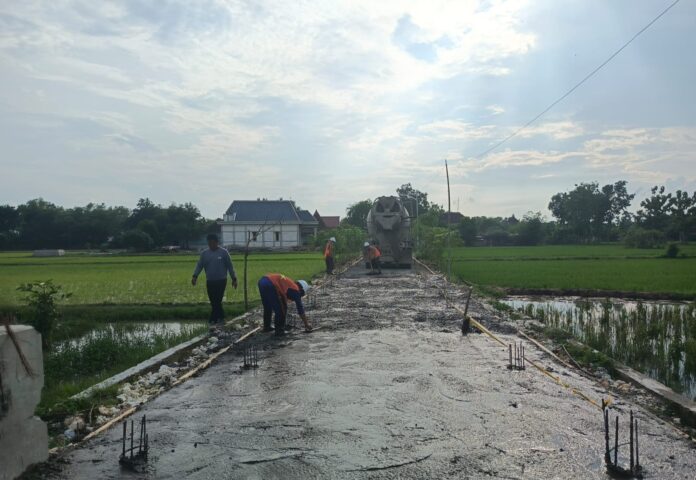 Di Desa Beged, Kecamatan Gayam, pembangunan jalan cor rigid kini memasuki tahap pengecoran dasar atau lean concrete.