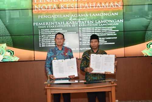 Pemerintah Kabupaten Lamongan menandatangani nota kesepahaman (MoU) bersama Pengadilan Agama Lamongan dan delapan belas stakeholder se-Kabupaten Lamongan sebagai upaya memperkuat pelayanan publik, pemenuhan hak perempuan dan anak, serta membangun ketahanan keluarga menuju Indonesia Emas 2045, Kamis (23/4) di Ruang Command Center Pemkab Lantai 3.