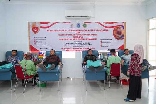Menyambut Hari Ulang Tahun (HUT) Ke-80 Republik Indonesia, pengurus daerah Lamongan Ikatan Notaris Indonesia (INI) dan Ikatan Pejabat Pembuat Akta Tanah (IPPAT), bersama Pemerintah Kabupaten Lamongan menggelar donor darah serentak se-Jawa Timur, di Kantor Palang Merah Indonesia (PMI) Kabupaten Lamongan.