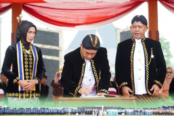 Pemerintah Kabupaten Madiun Peringati Hari Pendidikan Nasional (Hardiknas) 2025 di Alun alun Reksogati Caruban Jumat (2/5) dan melaunching Insersi kurikulum pencak silat masuk Mapel PJOK di tandatangani Bupati Madiun, H. Hari Wuryanto di dampingi dr. Purnomo Hadi dan Kadindikbud Kab Madiun, Siri Zubaidah.(sudarno/bhirawa)