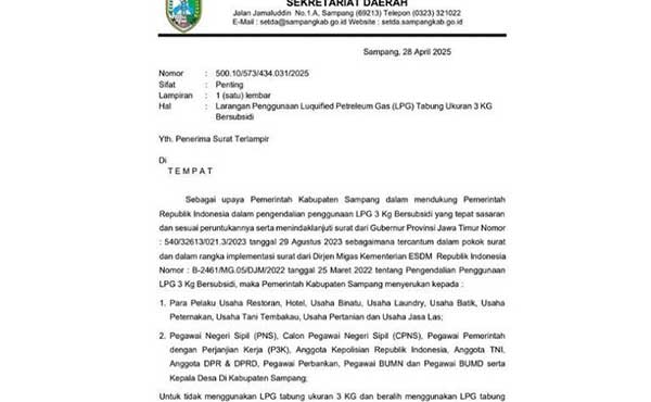 Pemerintah Kabupaten (Pemkab) Sampang mengeluarkan surat edaran yang berisi larangan peenggunaan LPG subsidi 3 kg, bagi Aparatur Sipil Negara (ASN) dan anggota Dewan Perwakilan Rakyat Daerah (DPRD), dan beberapa kelompok masyarakat dan pelaku usaha. Mereka dihinbau untuk beralih menggunakan LPG non-subsidi.