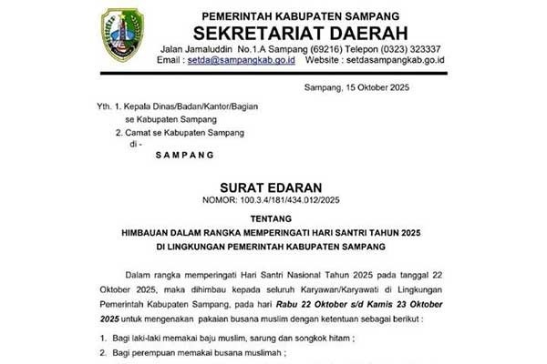 Pemkab Sampang akan memperingati Hari Santri Nasional Tahun 2025 pada tanggal 22 Oktober 2025. Dalam rangka memperingati hari tersebut, Pemkab Sampang mengeluarkan Surat Edaran Nomor: 100.3.4/181/434.012/2025 tentang Himbauan dalam Rangka Memperingati Hari Santri Tahun 2025.