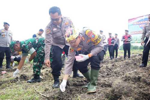Jajaran Polres Situbondo bersama petani dan Pemerintah Kabupaten menggelar aksi tanam jagung serentak di lahan Desa Gelung, Kecamatan Panarukan, Sabtu (7/3) sore. Kegiatan ini merupakan langkah nyata di tingkat daerah guna menyukseskan program ketahanan pangan nasional yang digagas Presiden Republik Indonesia, Prabowo Subianto.