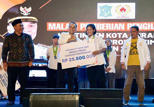 Pemkot Surabaya membagikan bonus kepada para atlet maupun pelatih yang berhasil meraih prestasi di Pekan Olahraga Provinsi (Porprov) IX Jatim yang digelar di Malang Raya. Total bonus mencapao Rp42,7. Penyerahan bonus ini dilakukan secara simbolis di Balai Kota Surabaya pada Rabu (8/10) malam.