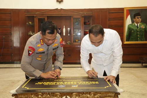 Penyerahan bangunan yang telah tuntas direnovasi tersebut ditandai dengan penandatanganan prasasti secara simbolis oleh Wali Kota Surabaya, Eri Cahyadi dan Kapolrestabes Surabaya, Kombes Pol. Dr. Luthfie Sulistiawan bertempat di rumah dinas Wali Kota, Selasa (14/4/2026).