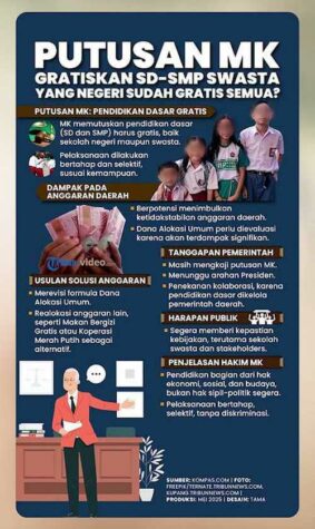 MK mengabulkan Sebagian gugatan yang diajukan Jaringan Pemantau Pendidikan Indonesia (JPPI), dan tiga pemohon per-orangan. MK berpandangan “pembatasan pembiayaan hanya untuk sekolah negeri menciptakan kesenjangan akses, terutama karena keterbatasan daya tampung sekolah negeri.” Maka yang gratis, bukan hanya sekolah negeri. Melainkan juga swasta.