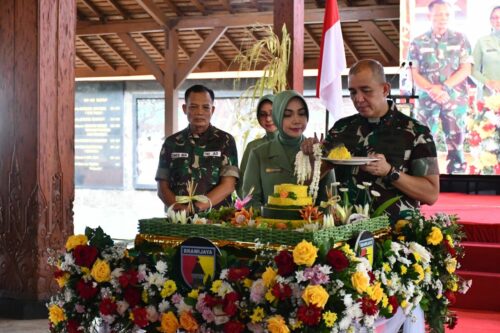Tampak Pangdam V/ Brawijaya saat memotong tumpeng yang diberikan kepada Anggota tertua usia di Pendopo Agung Trowulan, jumat 19/12/25.