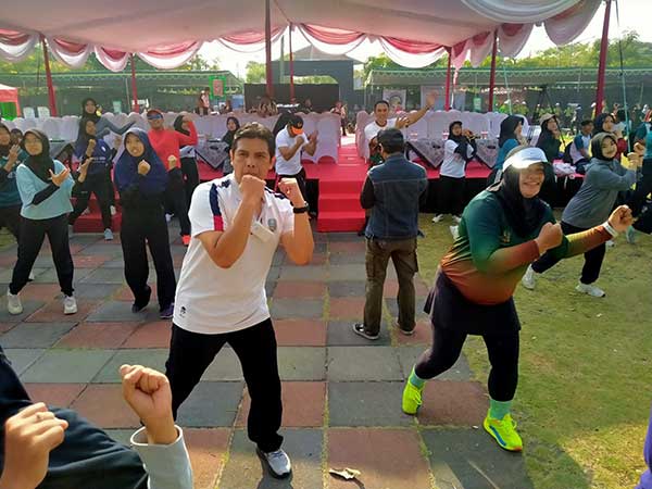 Kepala Dispora Jatim, M Hadi Wawan Guntoro bersama seluruh pejabat maupun staf maupun peserta juga mengikuti kegiatan senam. Dengan dipandu instruktur di atas panggung.
