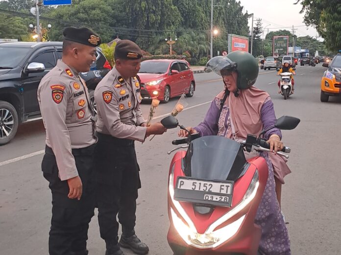 Kasat Samapta Polres Situbondo, Iptu Rachman Fadli Kurniawan, saat membagikan bunga pada pengendara roda dua diperempatan alun alun kota. Sawawi/bhirawa