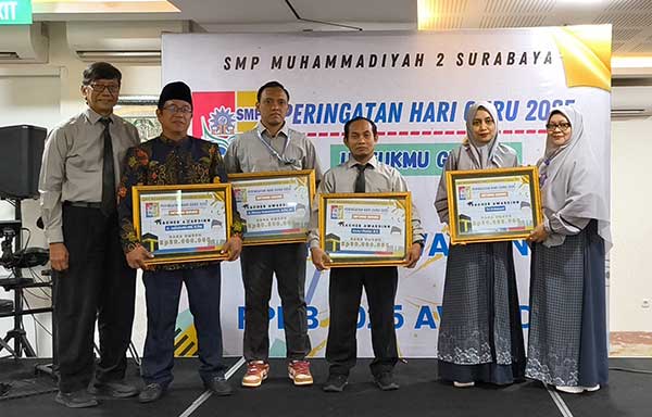 Hari Guru Nasional (HGN) rutin diperingati setiap tanggal 25 November. Di momen ini, SMP Muhammadiyah 2 Surabaya punya cara yang berbeda sebagai ungkapan terimakasih atas jasa para gurunya. Sekolah memberikan apresiasi tertinggi berupa hadiah umroh kepada empat guru yang dinilai memiliki loyalitas dan dedikasi luar biasa. Program penghargaan ini telah memasuki tahun keempat pelaksanaannya.