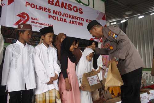 Dalam rangka menyambut Hari Ulang Tahun Bhayangkara ke-79 yang jatuh setiap tanggal 1 Juli, Polres Mojokerto Kota melaksanakan kegiatan Bakti Sosial (Baksos) berupa pemberian paket sembako ke panti asuhan Al Mawaddah Jln Empunala Kota Mojokerto, Selasa (17/6)
