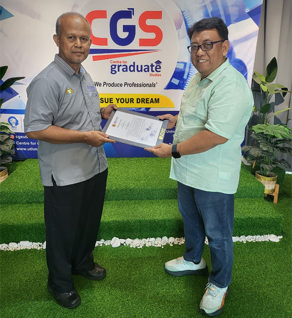 Sementara dari pihak Universiti Tun Hussein Onn Malaysia, penandatanganan dilakukan oleh Assoc. Prof. Ir. Dr. Rahisham Bin Abd Rahman selaku Deputy Dean (Graduate Development) Centre of Graduate Studies UTHM, yang juga didampingi oleh oleh Dean Centre of Graduate Studies Universiti Tun Hussein Onn Malaysia – Prof. Dr. Mohamad Zaky bin Noh.