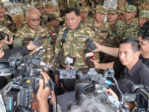 Menhan Jenderal (Purn) TNI Sjafrie Syamsudin saat meninjau langsung kegiatan retret PWI, di PKBN Desa Cibodas, Kecamatan Rumpin, Kabupaten Bogor, Jabar. foto: cahyono/Bhirawa.