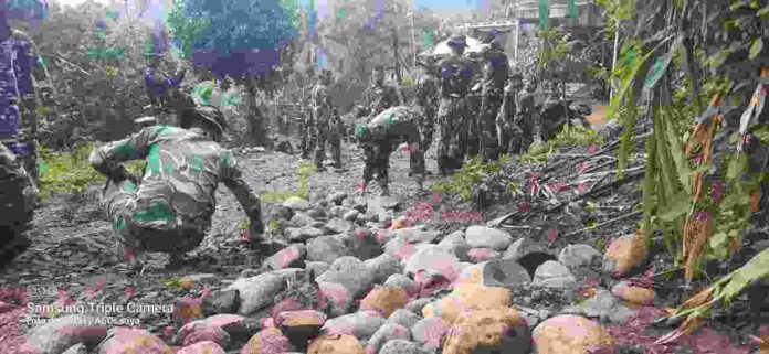 Kegiatan tersebut dipimpin langsung oleh Kapten Joni Kriswanto. Perbaikan dilakukan dengan membersihkan badan jalan serta menimbun bagian yang berlubang akibat digerus hujan deras dalam beberapa hari terakhir.