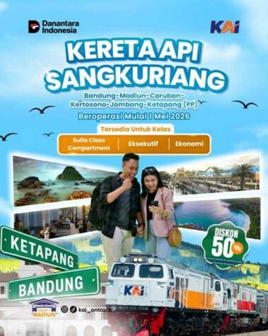 PT Kereta Api Indonesia (Persero) Daerah Operasi 7 Madiun menyambut baik rencana peluncuran KA Sangkuriang rute Bandung – Ketapang (PP) yang akan mulai beroperasi pada 1 Mei 2026. Kehadiran kereta api baru ini diharapkan menjadi angin segar bagi masyarakat di wilayah Daop 7 Madiun yang ingin merencanakan perjalanan healing, eksplorasi kuliner, maupun mengunjungi destinasi wisata seru di ujung barat maupun ujung timur Pulau Jawa maupun sebaliknya, dari ujung barat ataupun ujung timur Pulau Jawa ke wilayah Madiun dan sekitarnya.