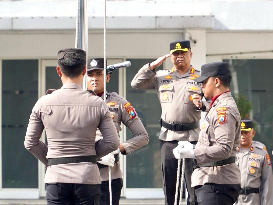 Kapolrestabes Surabaya, Kombes Pol Luthfie Sulistiawan memimpin Upacara Kesadaran Nasional, Senin (17/3). Dalam upacara, Kapolrestabes menekankan kepada seluruh personel jajaran untuk fokus akan terciptanya keamanan dan ketertiban masyarakat Kota Pahlawan.