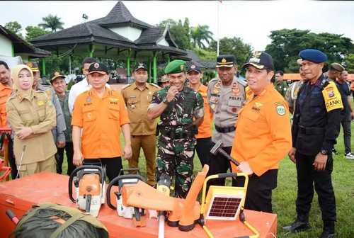 Pantauan di lokasi, Pj. Bupati Bondowoso, M. Hadi Wawan Guntoro melakukan penyematan pita kesiapsiagaan secara simbolis kepada perwakilan peserta satgas penanggulanan bencana.