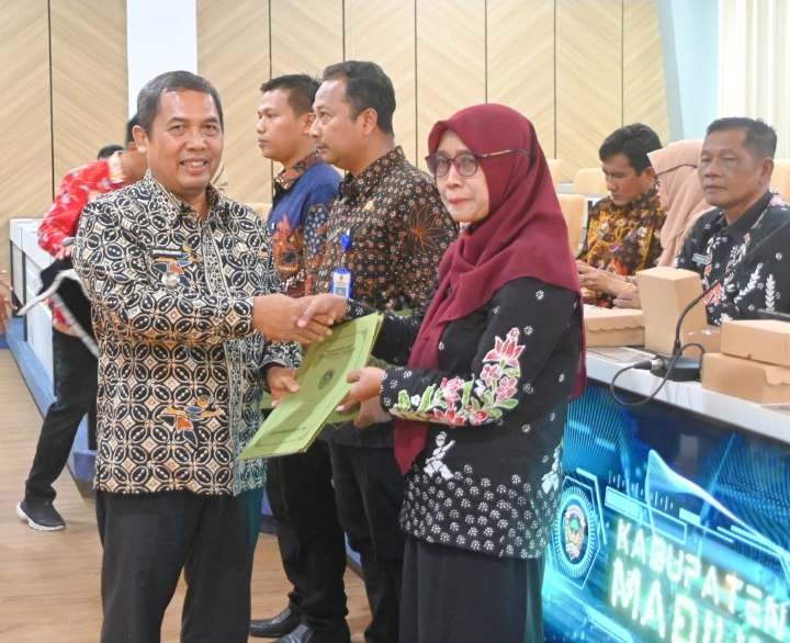 Pj Bupati Madiun, Ir. Tontro Pahlawanto menyerahkan Surat Keputusan (SK) kepada 3 Dewan Pengawas (Dewas) Rumah Sakit Umum Daerah (RSUD), Dolopo Kab Madiun, di ruang IT,