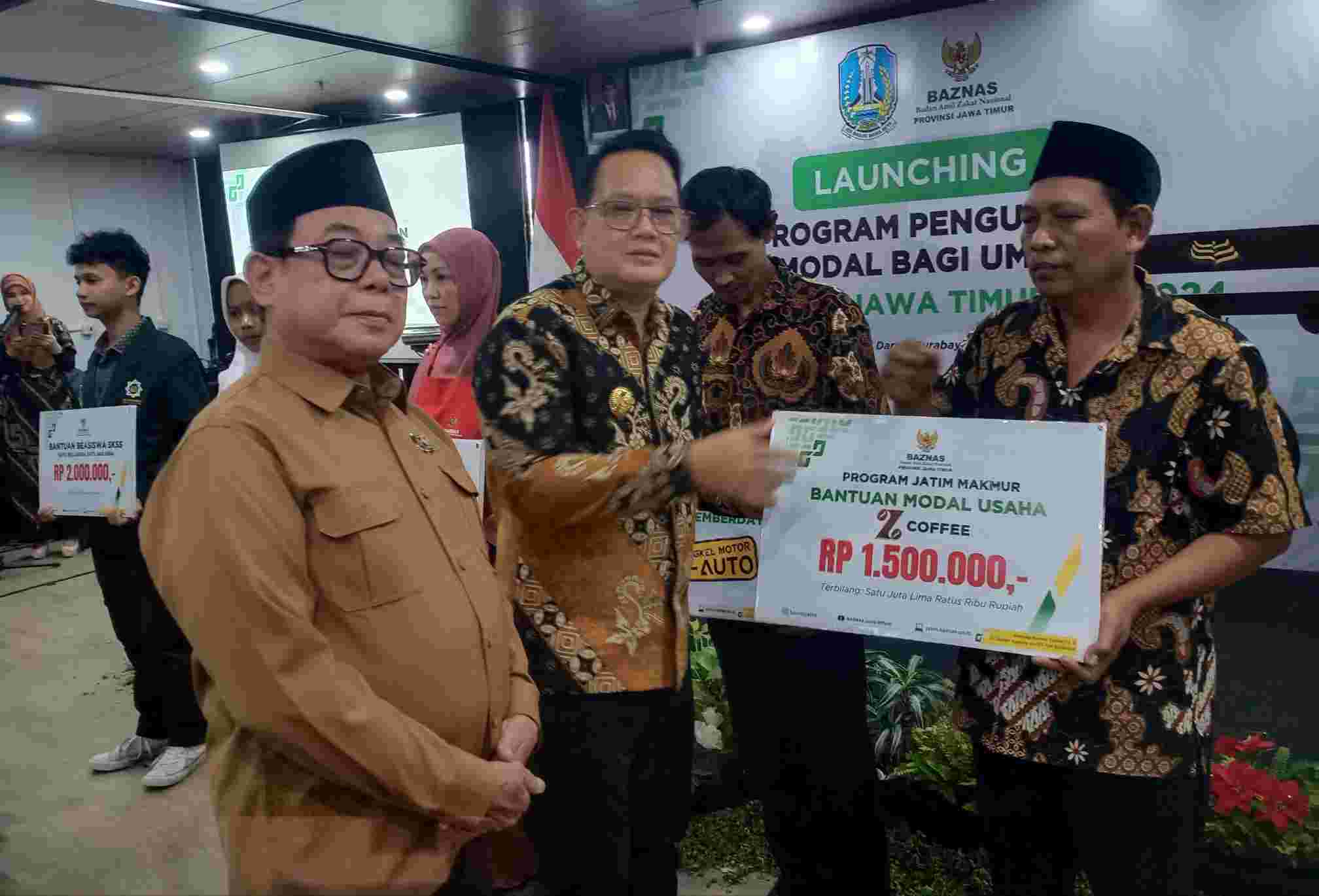 Penjabat (Pj) Gubernur Jatim Adhy Karyono melaunching program penguatan modal bagi UMKM, yang digagas Badan Amil Zakat Nasional (Baznas) Provinsi Jatim, Kamis (19/9). Program ini bertujuan untuk mendukung pelaku usaha mikro agar terbebas dari jeratan rentenir.