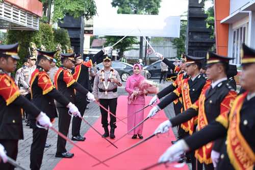 Barisan personel Polres Gresik, memberikan penghormatan saat AKBP Ramadhan Nasution memasuki gerbang Mapolres. Prosesi berlanjut dengan Tradisi Gapura Pedang Pora, di mana perwira pertama membentuk barisan pedang sebagai jalan kehormatan bagi pejabat baru. di bawah naungan pedang pora yang melambangkan doa dan harapan, agar senantiasa diberikan perlindungan, kekuatan, serta kebijaksanaan dalam mengemban tugas.