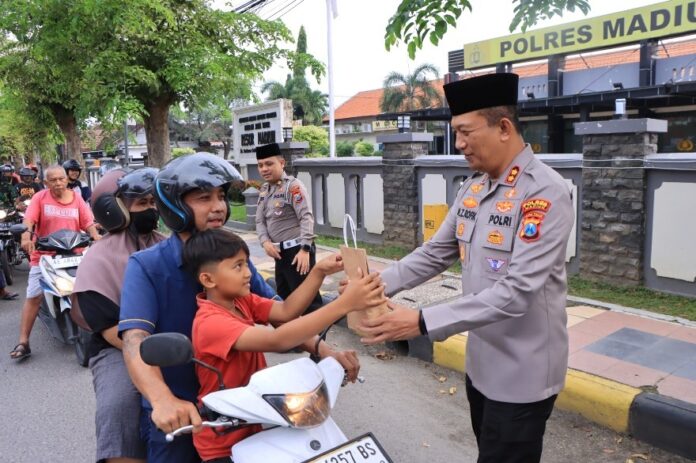 Semarakkan bulan suci Ramadan 1446 H, Kapolres Madiun AKBP Mohammad Zainur Rofik bersama jajarannya menggandeng media gelar aksi berbagi takjil kepada para pengendara yang melintas di depan Mapolres Madiun, Kamis (13/3).