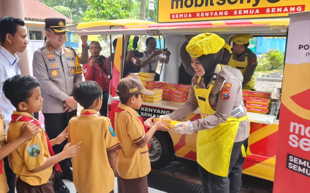 Polres Tulungagung membagikan makanan bergizi dan susu pada siswa-siswi SDN 1 Tanggunggunung dan SDN 3 Tanggunggunung, Jumat (1/11). Pemberian makanan bergizi ini untuk mendukung program Presiden Prabowo Subianto.