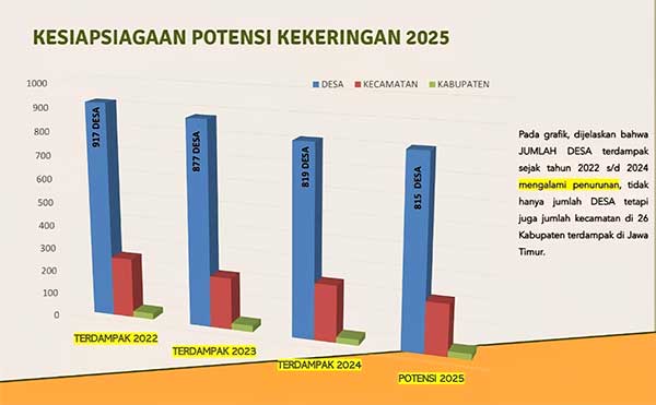 Ditambahkannya, tahun 2025 ini, potensi kekeringan terjadi di sebanyak 815 Desa. Jumlah tersebut terdapat di 222 Kecamatan dan 26 Kabupaten yang ada di wilayah Jawa Timur. Namun kemungkinan akan bertambah dan akan meluas.