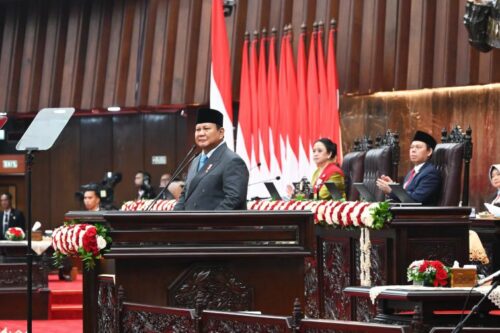 Presiden Prabowo Subianto saat menyampaikan Nota Keuangan APBN 2026 dalam Rapat Paripurna Bersama DPR-DPD RI, di Kompleks Parlemen Senayan, Jakarta, Jumat (15/8/2025).