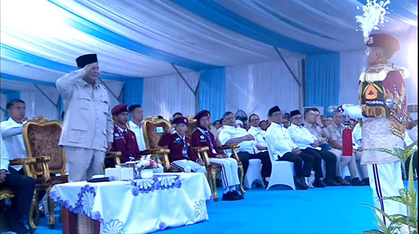 Presiden RI, Prabowo Subianto mengapresiasi sebuah pertunjukan, berupa variasi baris berbaris Pocil (Polisi Cilik) Sekolah Rakyat pada acara Peresmian 166 Sekolah Rakyat di 34 Provinsi, di Banjarbaru, Kota Banjarbaru, Kalimantan Selatan, Senin (12/1) kemarin.